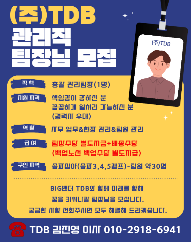 주식회사 TDB에서 관리자급 팀장님 모집합니다.